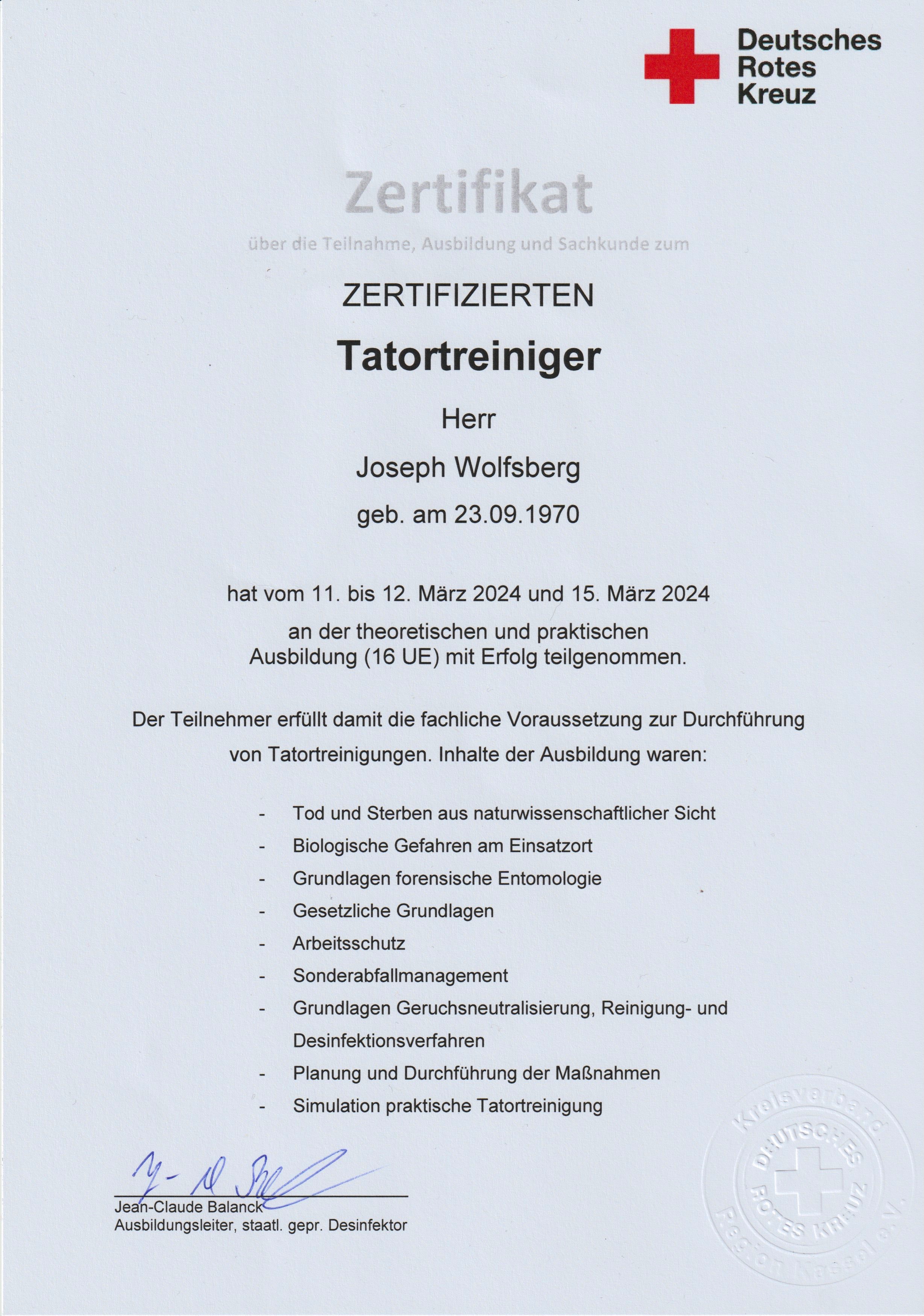 TATORTREINIGER ZERTIFIKAT