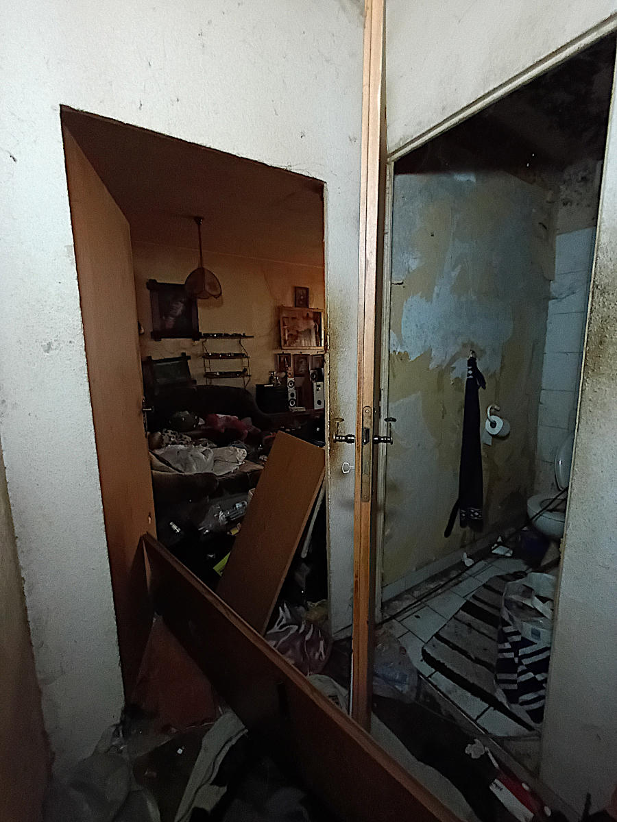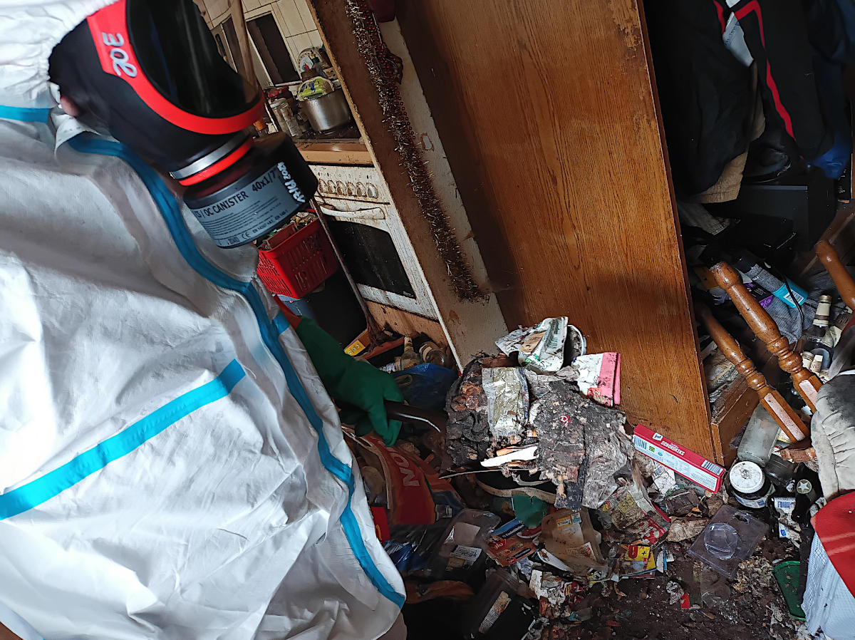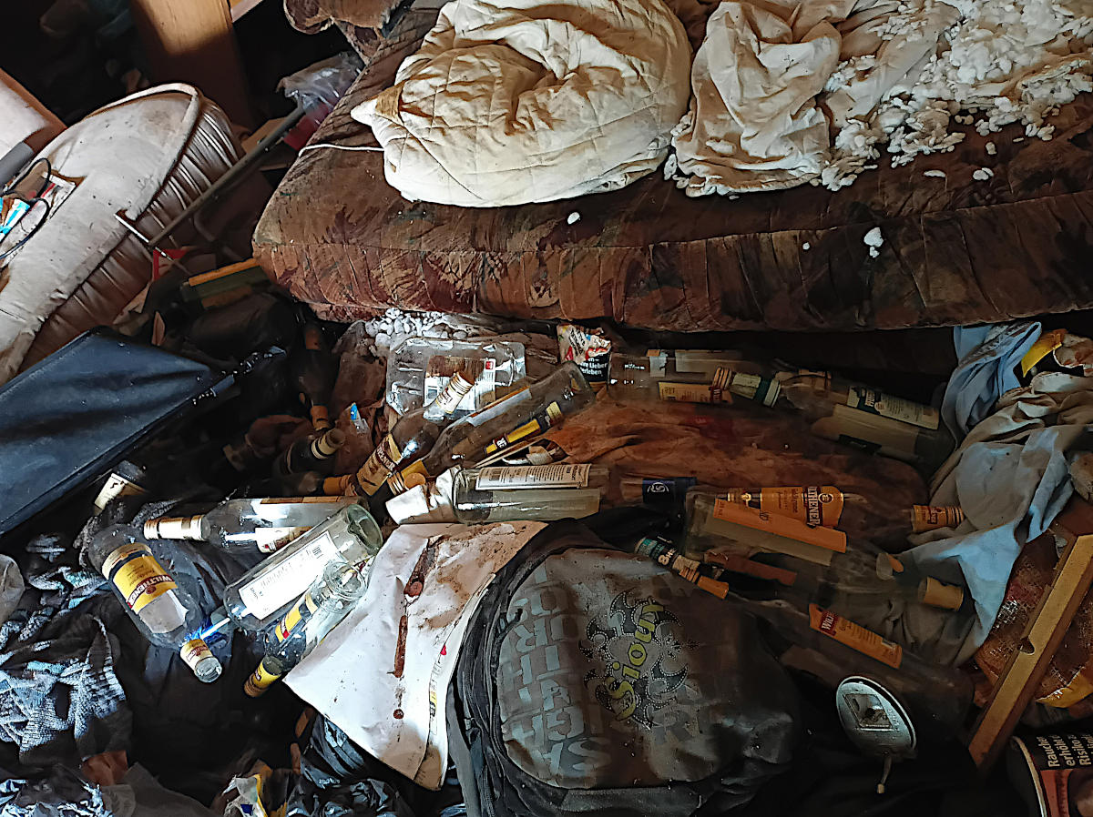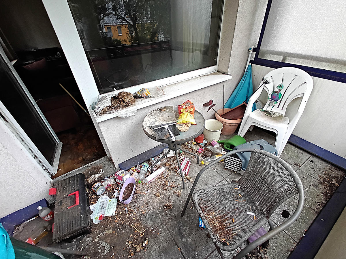 BESONDERHEIT:Der Zugang zum Leichenfundort war nur über den Balkon (Erdgeschoss) möglich, da die starke Vermüllung eine Begehung und Räumung durch die Wohnungstür verhinderte. Außerdem hätte eine Räumung durch die Wohnungstür aufgrund der verschimmelten Wände dafür gesorgt, dass sich milliarden an Schimmelpilzsporen, im gesamten Treppenhaus verteilt hätten.