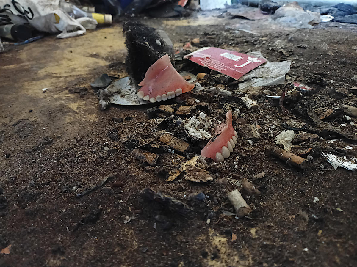 Gebiss unter dem Müll auf dem Fußboden