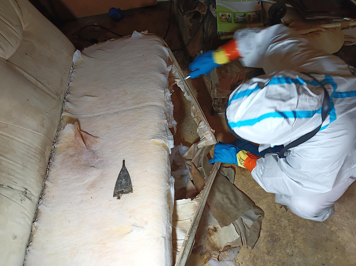 Dekontamination durch raustrennen der mit Leichenflüssigkeit getränkten Sofastoffe