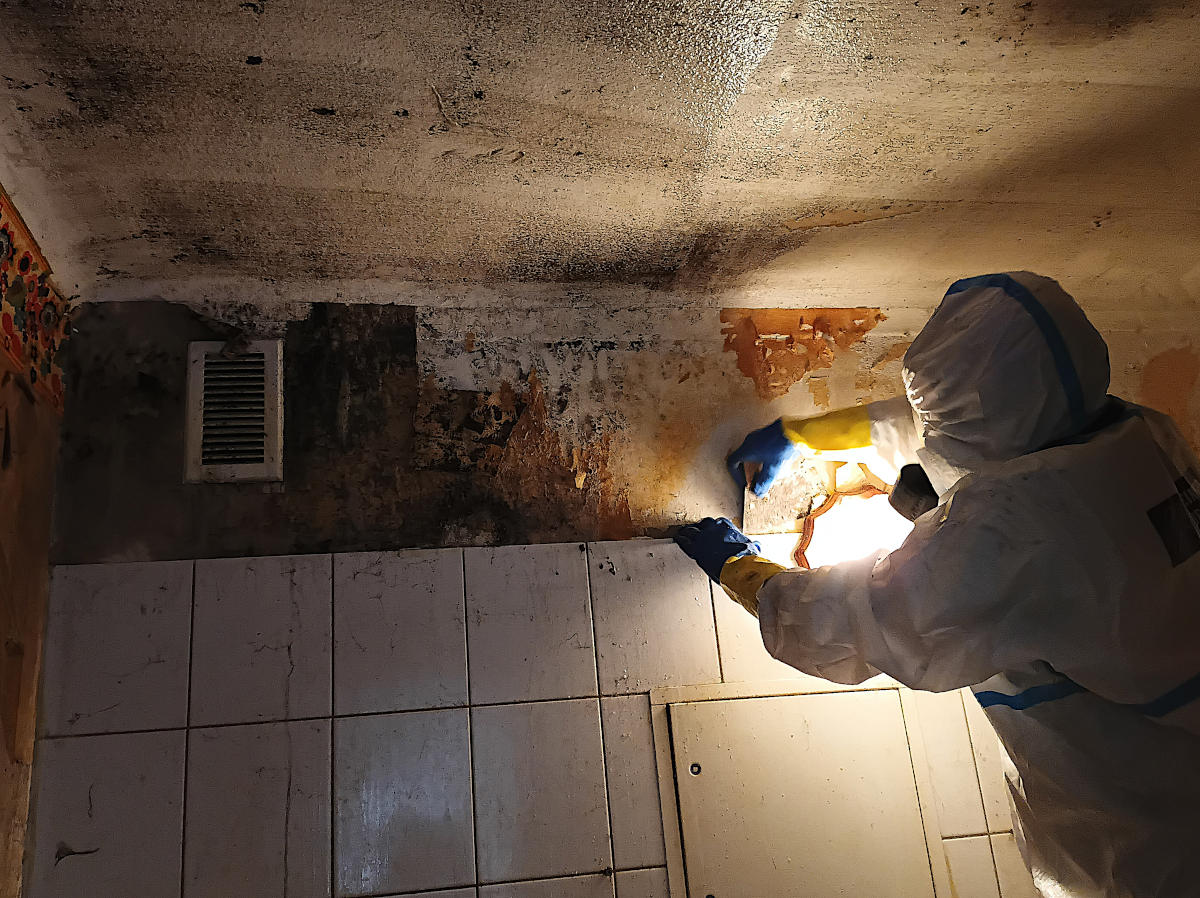 Tatortreinigung Entfernen der verschimmelten Tapete im Bad unter Vollschutz