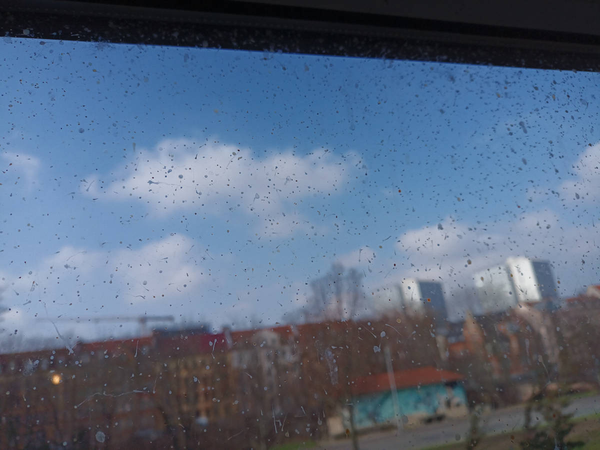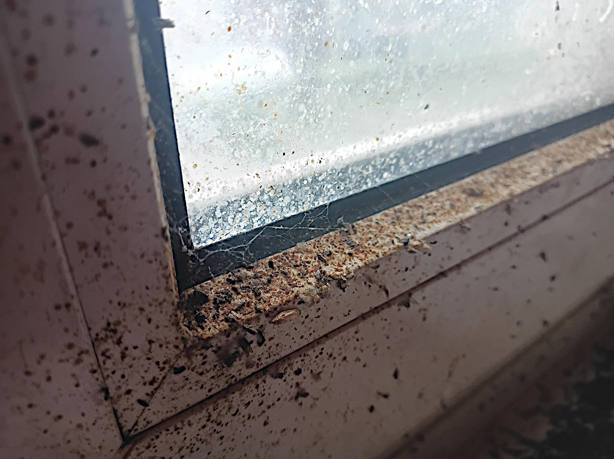 Durch Fliegenkot verschmutzes Fenster