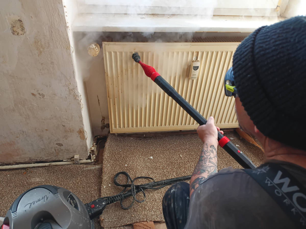 Dampfreinigung (5 Bar) und Desinfektion (+150C) der kontaminierten Heizkörper
