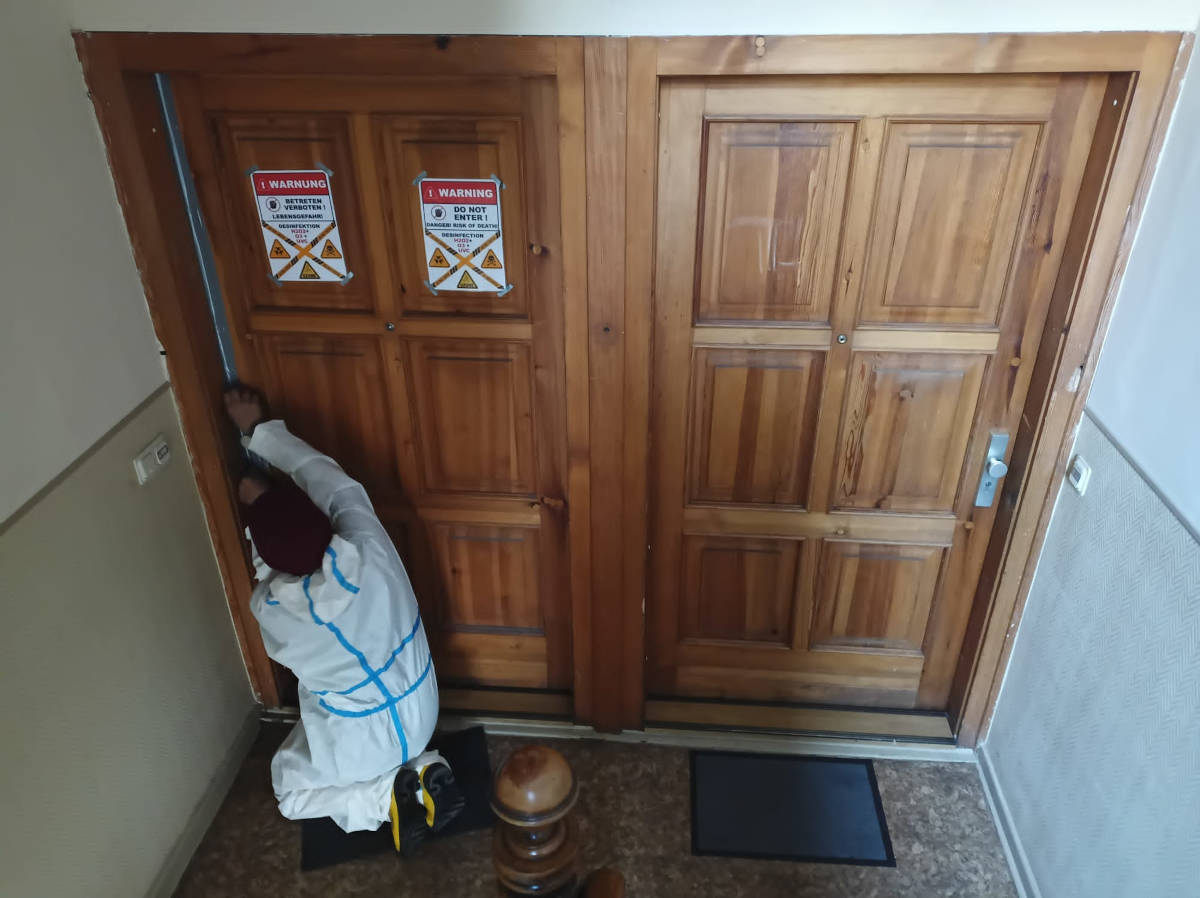 Beaufsichtigung der O3 Desinfektion vor der Wohnungstür